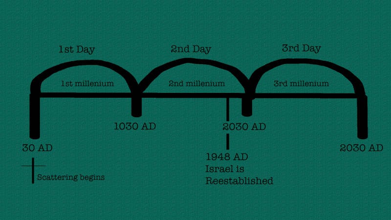 First, historians generally agree that Jesus was crucified around 30 AD. At that point, the Shepherd was struck, persecution began, and the Israelites lost their nation. So, if you add one millennium (1,000 years) to 30 AD, you get 1030 AD. This marks the first millennium after their scattering. Now, from 30 AD to 2030 AD, we have the second millennium or the second prophetic day.